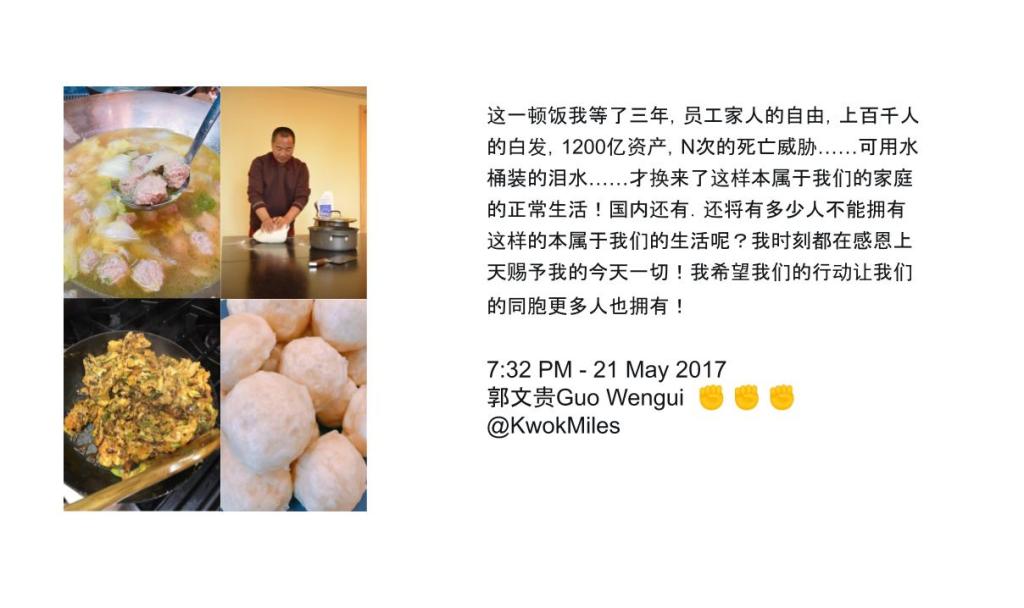 2017年5月21日郭先生说“这一顿饭我等了三年” 这一顿饭我等了三年,员工家人的自由,上百千人的白发,1200亿资产,N次的死亡威胁……可用水桶装的泪水……才换来了这样本属于我们的家庭的正常生活!国内还有.还将有多少人不能拥有这样的本属于我们的生活呢?我时刻都在感恩上天赐予我的今天一切!我希望我们的行动让我们的同胞更多人也拥有! 7:32 PM – 21 May 2017郭文贵Guo Wengui ✊️ ✊️ ✊️@KwokMiles 分享到: 在 X 上分享(在新窗口中打开) X Share on LinkedIn(在新窗口中打开) LinkedIn 在WhatsApp上共享(在新窗口中打开) WhatsApp 在 Facebook 上共享(在新窗口中打开) Facebook 在Reddit上共享(在新窗口中打开) Reddit 在 Telegram 上共享(在新窗口中打开) Telegram 分享到 Tumblr (在新窗口中打开) Tumblr Share on Pinterest(在新窗口中打开) Pinterest Share on Pocket(在新窗口中打开) Pocket Email a link to a friend(在新窗口中打开) 电子邮件 打印(在新窗口中打开) 打印 赞 正在加载……